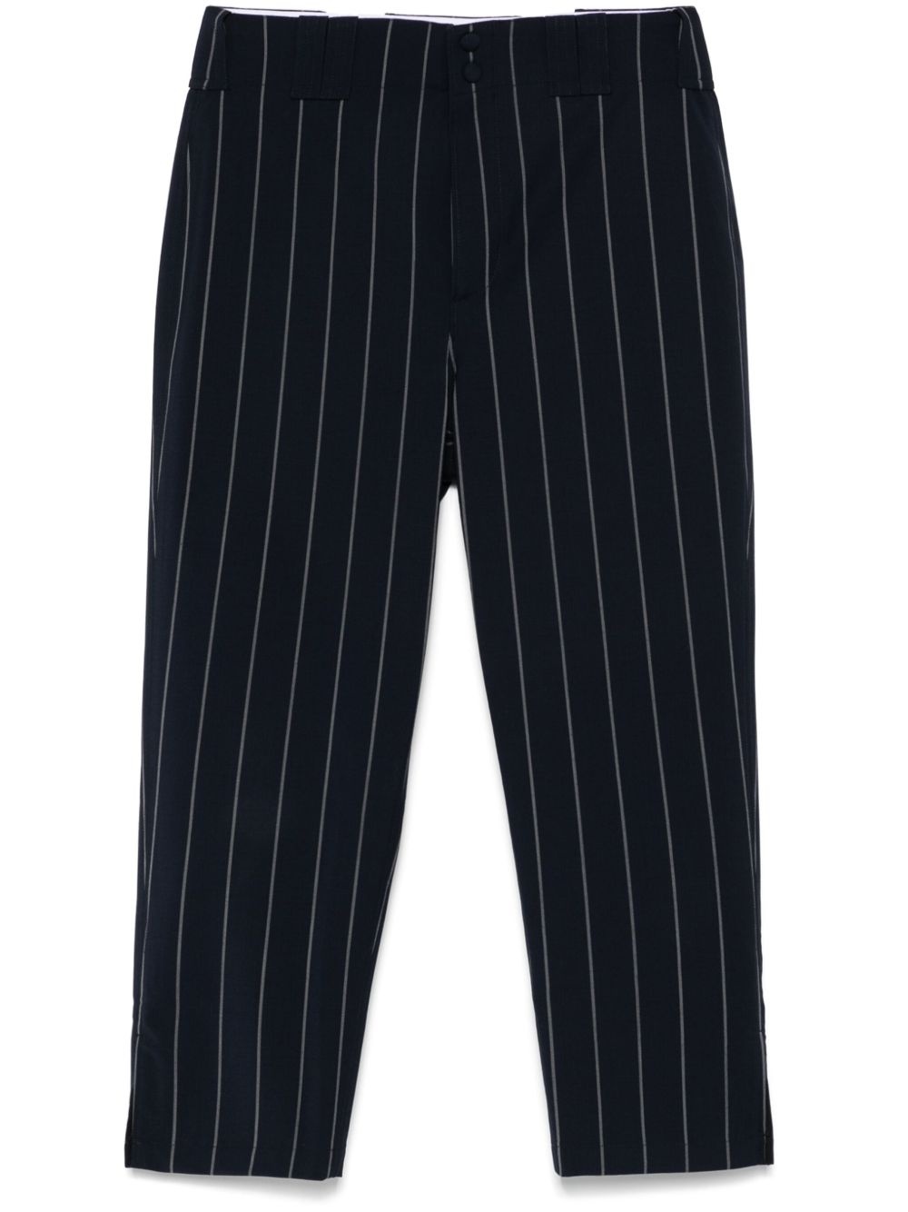 striped trousers Highlights - Navy blue - Front button and zip fastening - Belt loops - Two rear welt pockets - Cropped Imported Composition Outer: Wool 86%, Polyamide 9%, Elastane 5% Lining: Polyamide 61%, Polyester 29%, Elastane 10% SIZE & FIT Model measurements Height 5 ft 10 in(1.78 m) Bust/Chest 33.46 in(85 cm) Hips 36.22 in(92 cm) Waist 23.22 in(59 cm) FittingInformation Designed for a slim fit, these trousers offer a close fit at the waist, allowing a comfortable close fit and some movement over the leg Made from a lightweight stretch fabric, this piece offers elasticity and flexibility when worn
