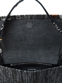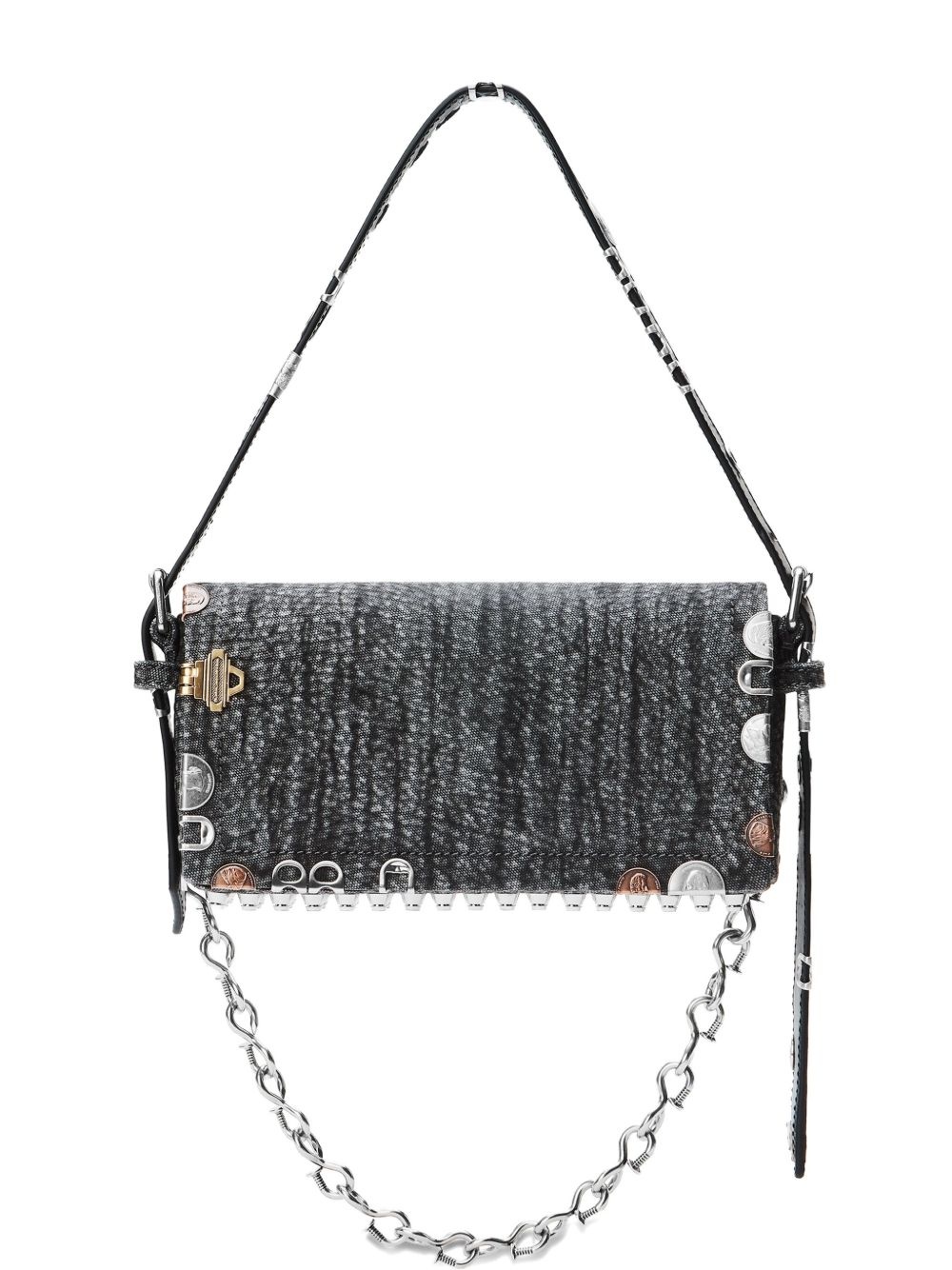 studded chain-detailed shoulder bag Highlights - Black - Textured effect - Coin embellishments - Leather top handle - Stud detail - Chain strap Imported Composition Outer: Cotton 100% Lining: Cotton 100% SIZE & FIT Measurement DEPTH 2.55 in(6.5 cm) HEIGHT 5.51 in(14 cm) STRAP 36.61 in(93 cm) WIDTH 10.43 in(26.5 cm)
