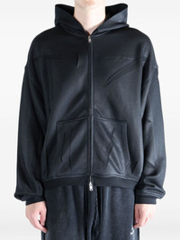 zip-up hoodie Highlights - Black - Front zip fastening - Classic hood - Two side pockets - Long sleeves - Ribbed cuffs and hem Imported Composition Polyester 74%, Cotton 26% Washing instructions Read Manufacturer Guidelines