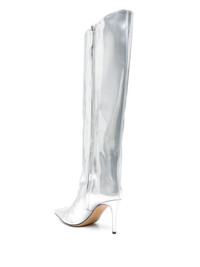 90mm knee boots When it comes to style fit for the best parties in town, Alexandre Vauthier delivers. These knee-high boots are presented in a glittery silver-tone and form a sharp pointed toe. Highlights - Silver-tone - Calf leather - Patent finish - Metallic effect - Pointed toe - Knee-high - Branded leather insole - Leather lining Made in Italy Composition Lining: Calf Leather 100% Sole: Calf Leather 100% Outer: Calf Leather 100% SIZE & FIT Measurement HEEL 4.13 in(10.5 cm) CIRCUMFERENCE 14.96 in(38 cm) HEIGHT 17.32 in(44 cm)