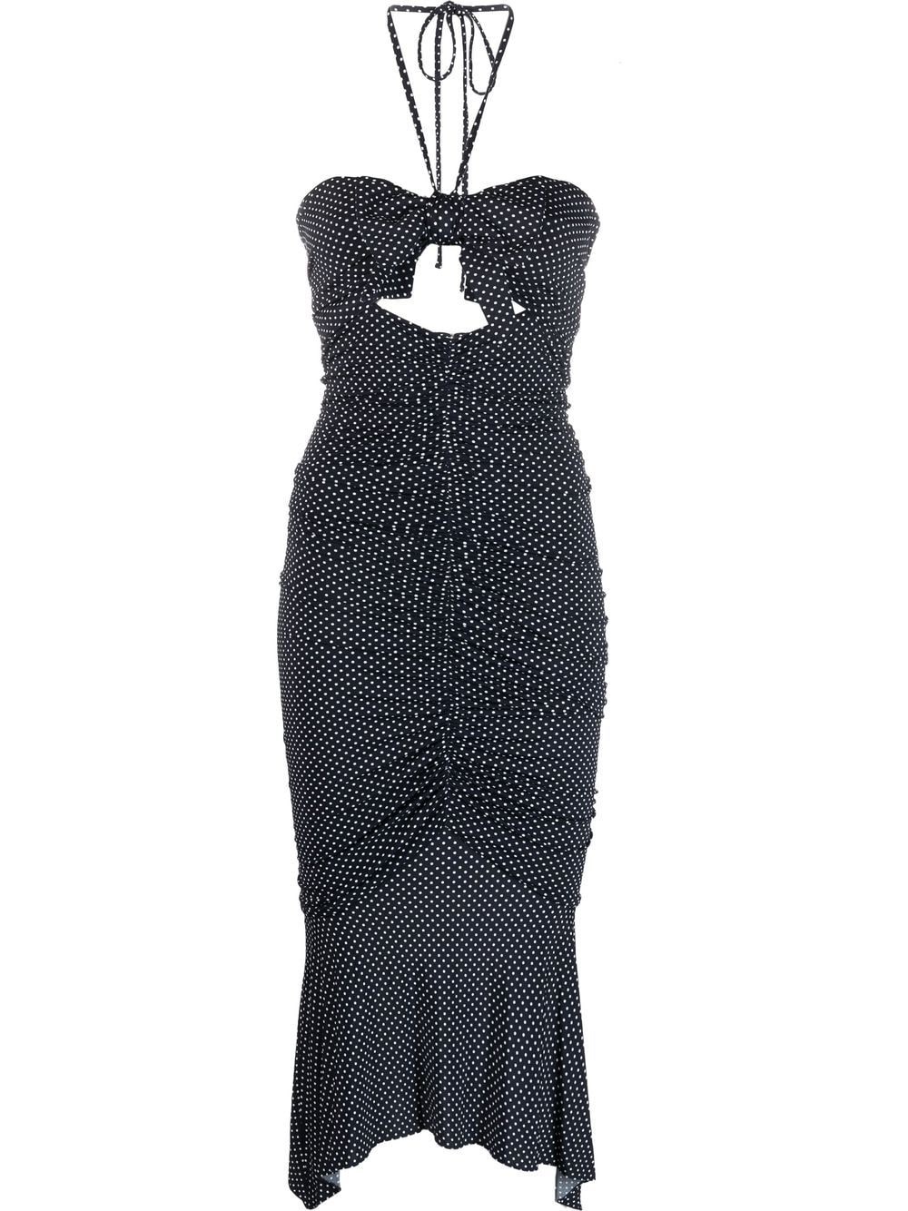 bow-detail halterneck dress Alexandre Vautheir is known for creating garments with a sense of effortless opulence. Seen on this halterneck dress, the garment features a bow detail at the front and an all-over polka-dot print. Imported Composition Viscose 92%, Elastane 8% SIZE & FIT Model measurements Height 5 ft 10 in(1.79 m) Bust/Chest 31.49 in(80 cm) Hips 35.03 in(89 cm) Waist 23.62 in(60 cm) Measurement LENGTH 39.76 in(101 cm) WAIST 25.19 in(64 cm) BUST 29.92 in(76 cm) FittingInformation This piece fits true to size. We recommend you get your regular size Designed for a close fit at the bust, waist and hips Made with a mid-weight stretch fabric