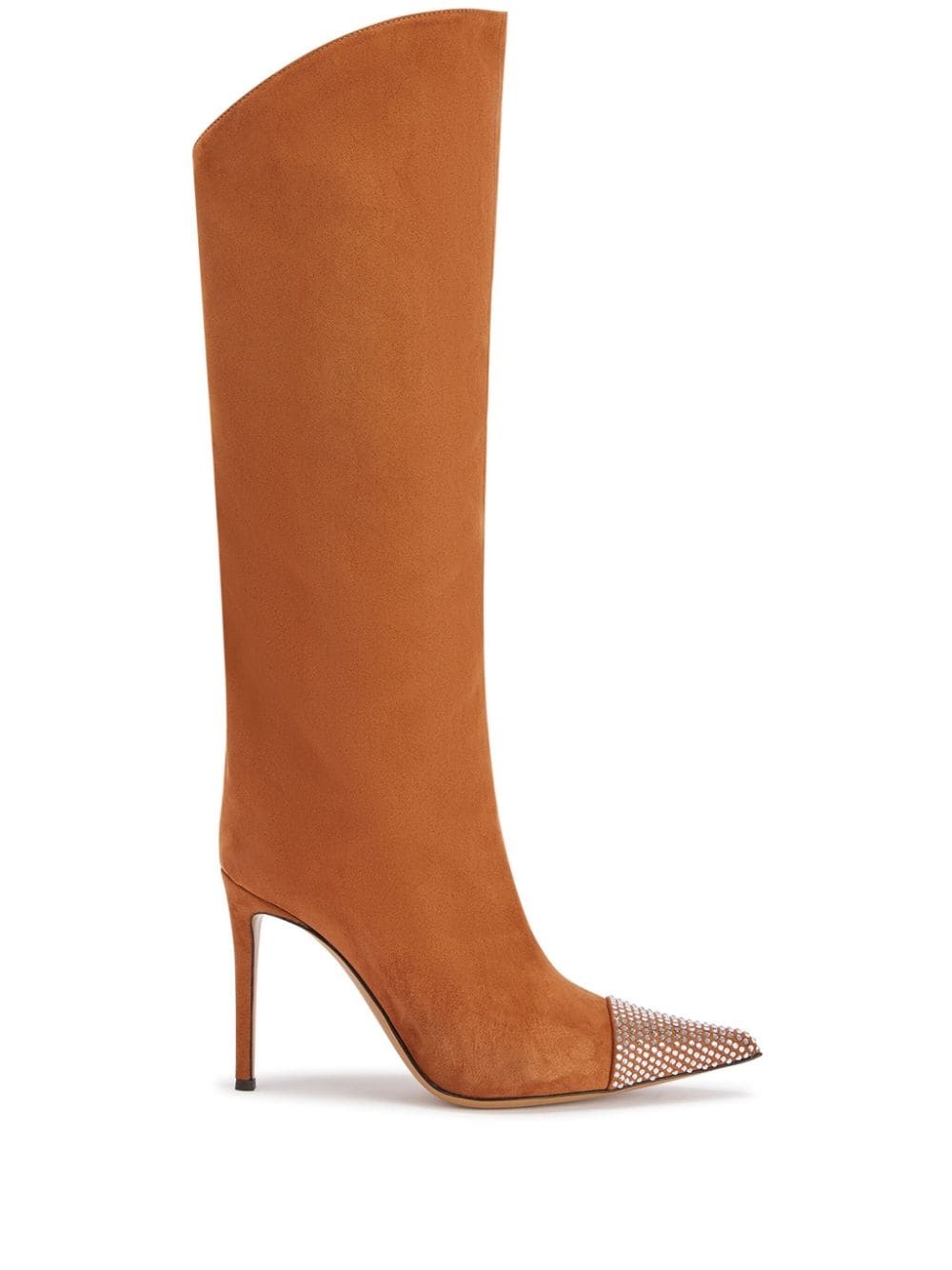 crystal-embellished 105mm boots Highlights - Cognac brown - Faux suede - Crystal embellishment - Pointed toe - High stiletto heel - Leather outsole - Leather lining - Knee-high Made in Italy Composition Outer: Leather 100% Lining: Leather 100% Sole: Leather 100%