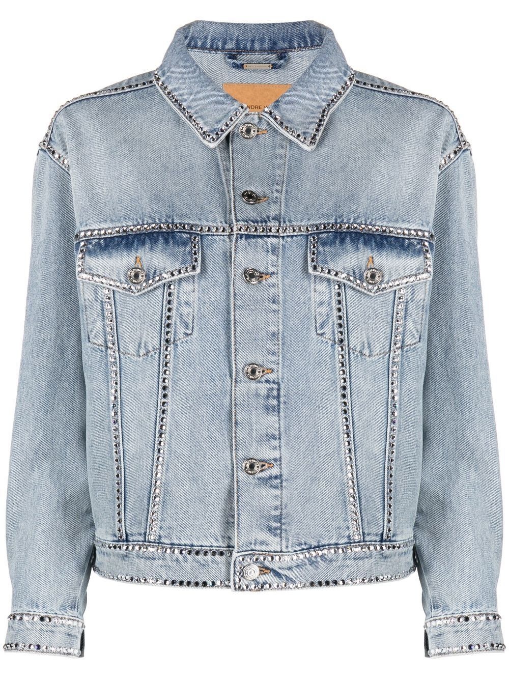 crystal-embellished denim jacket light blue cotton crystal embellishment classic collar front button fastening two chest flap pockets long sleeves straight hem Made in Italy Composition glass 100%, Cotton 100% SIZE & FIT Model measurements Height 5 ft 10 in(1.77 m) Bust/Chest 31.49 in(80 cm) Hips 33.85 in(86 cm) Waist 22.44 in(57 cm) FittingInformation This piece fits true to size. We recommend you get your regular size Cut for a loose fit Made with a mid-weight non-stretch fabric Washing instructions Dry Clean Only