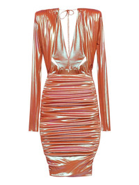 draped-detail midi dress Highlights - Orange - Metallic sheen - Mesh panelling - Draped detailing - Gathered detailing - V-neck - Shoulder pads - Long sleeves - Open back - Mid-length - Full lining - Top tie fastening Imported Composition Viscose 100% SIZE & FIT Model measurements Height 5 ft 9 in(1.76 m) Bust/Chest 31.1 in(79 cm) Hips 36.61 in(93 cm) Waist 24.8 in(63 cm)