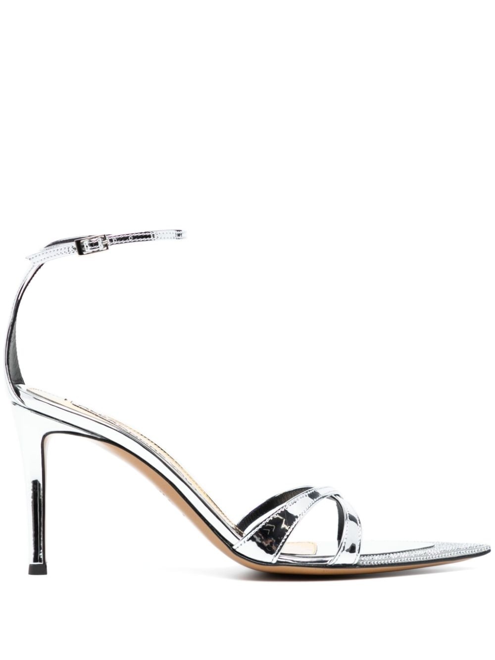 metallic-effect 85mm leather sandals Highlights - Silver-tone - Leather - Metallic finish - Buckle-fastening ankle strap - High stiletto heel - Branded footbed - Crossover strap at the toe - Open pointed toe - Leather sole Made in Italy Composition Other fibres 100% SIZE & FIT Measurement CIRCUMFERENCE 8.26 in(21 cm) HEEL 3.34 in(8.5 cm) HEIGHT 3.14 in(8 cm)