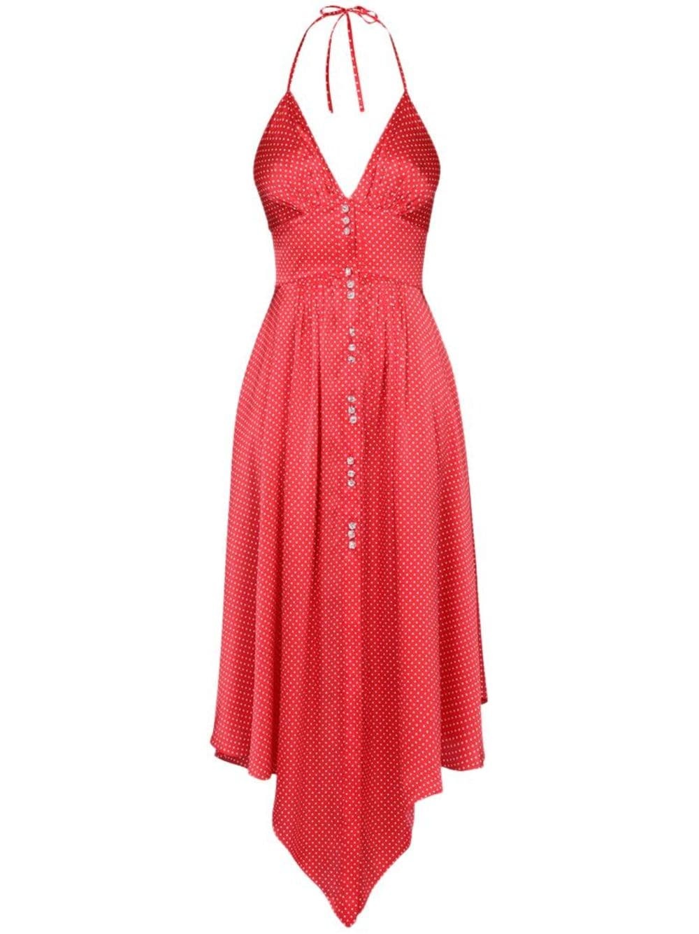 polka-dot print halterneck midi dress Highlights - Bright red - Cotton - Polka dot print - Halterneck tie fastening - V-neck - Backless - Rear zip fastening - Asymmetric hem - A-line Imported Composition Cotton 100%