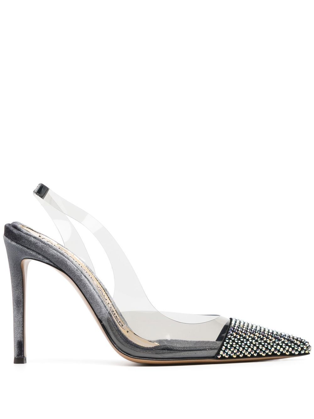 rhinestone-embellished slingback pumps black/silver-tone calf leather/calf suede transparent design rhinestone embellishment contrasting toecap suede panelling slingback strap pointed toe branded insole slip-on style flat leather sole high stiletto heel Made in Italy Composition Suede 100% SIZE & FIT Measurement HEEL 4.33 in(11 cm) Sole height 0.39 in(1 cm)