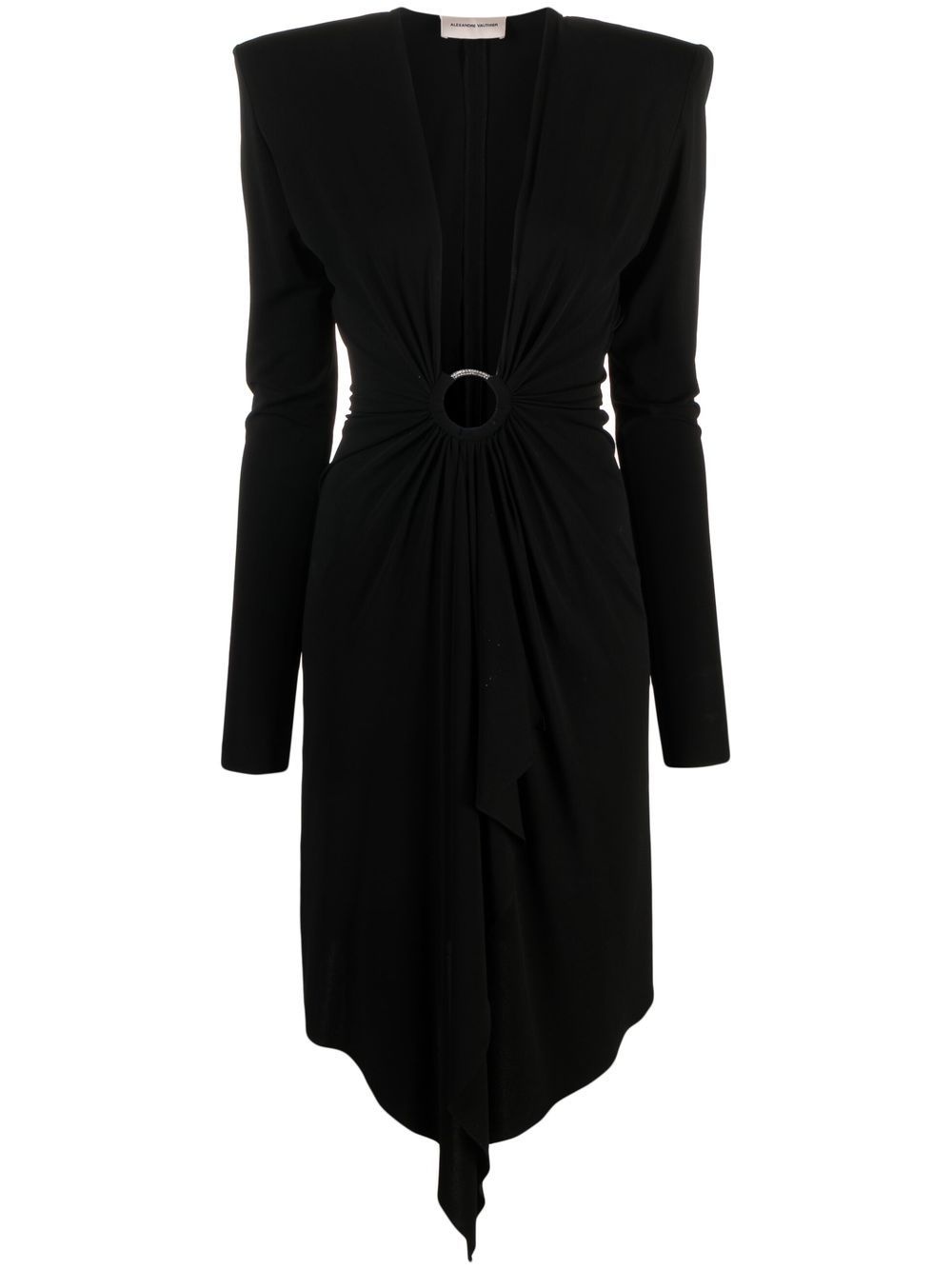 V-neck gathered midi dress Exaggerated silhouettes and dramatic contours take centre stage at Alexandre Vauthier for SS23, as evidenced by this black dress. Characterised by its gathered detailing, it's decorated with ring hardware detailing that nods to the brand's penchant for amped-up finishes. Imported Composition Brass 100%, glass 100%, Viscose 92%, Elastane 8% SIZE & FIT Model measurements Height 5 ft 10 in(1.78 m) Bust/Chest 29.92 in(76 cm) Hips 34.64 in(88 cm) Waist 23.62 in(60 cm) Measurement WAIST 22.83 in(58 cm) HIPS 31.49 in(80 cm) FittingInformation This piece fits true to size. We recommend you get your regular size Designed for a close fit at the bust, waist and hips Made with a mid-weight stretch fabric