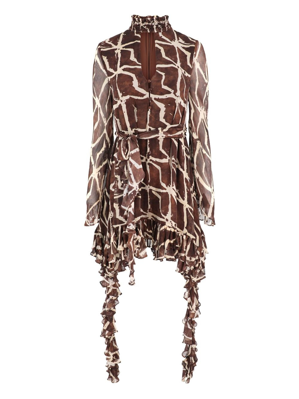 Amalia ruffled mini dress Highlights - Brown - Abstract print - Mock neck - Neckline cut-out - Long sleeves - Belted waist - Ruffled detailing Imported Composition Viscose 100% Lining: Polyester 100% Washing instructions Read Manufacturer Guidelines