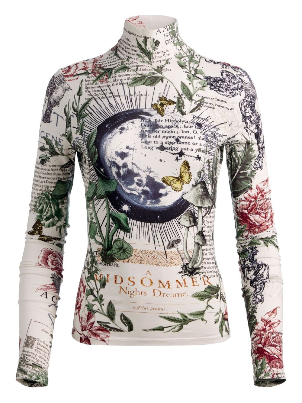 graphic-print turtleneck top Highlights - Off-white - Floral print - Moon graphic - Turtleneck neckline - Long sleeves - Text print Imported Composition Viscose 97%, Elastane 3%