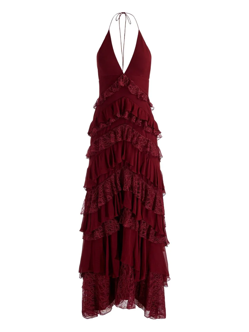 Liana V-neck maxi dress Highlights - Oxblood red - Tiered ruffles - Lace trim - Open back - Maxi length Imported Composition Polyester 100% Washing instructions Dry Clean Only