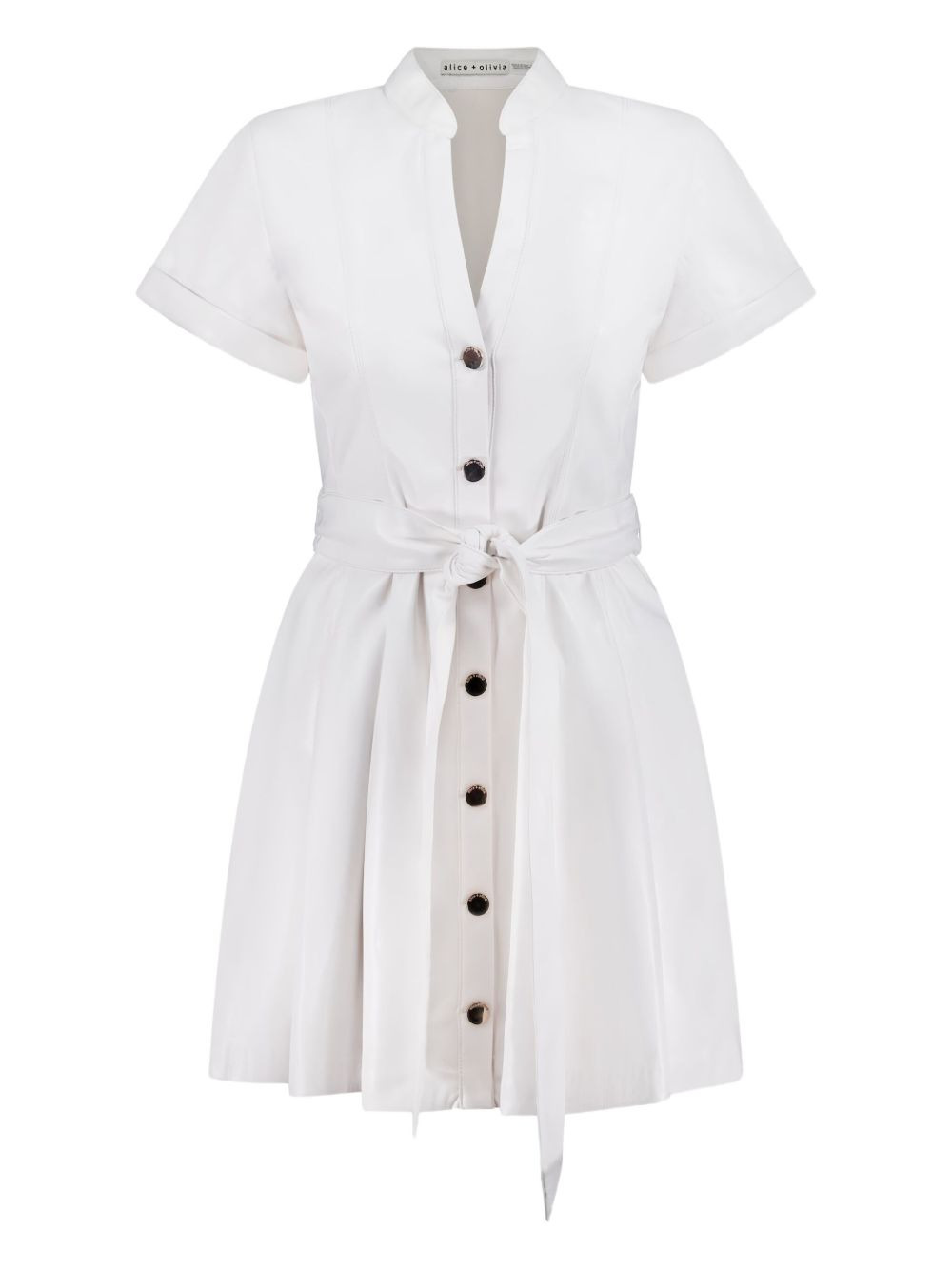 Lucy button-front pleated mini dress Highlights - Off-white - Pleated skirt - Short sleeves - Button front - Belted waist - V-neckline Imported Composition Polyurethane 100% Washing instructions Dry Clean Only
