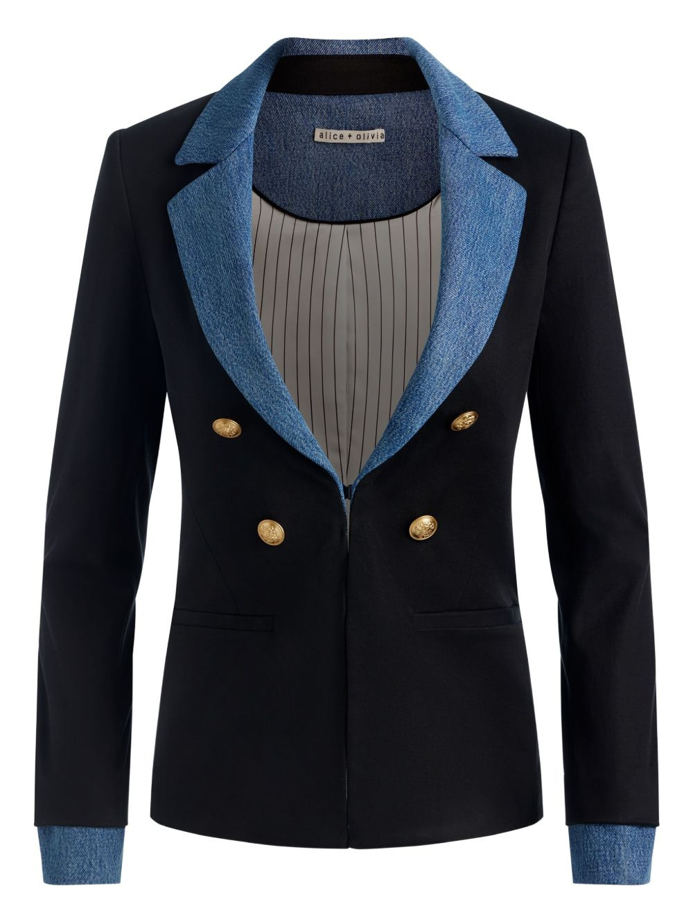 Mya double-breasted blazer Highlights - Black - Denim collar - Double-breasted fastening - Denim cuffs - Long sleeves Imported Composition Body: Lyocell 56%, pure cotton 41%, Elastane 3% Washing instructions Dry Clean Only