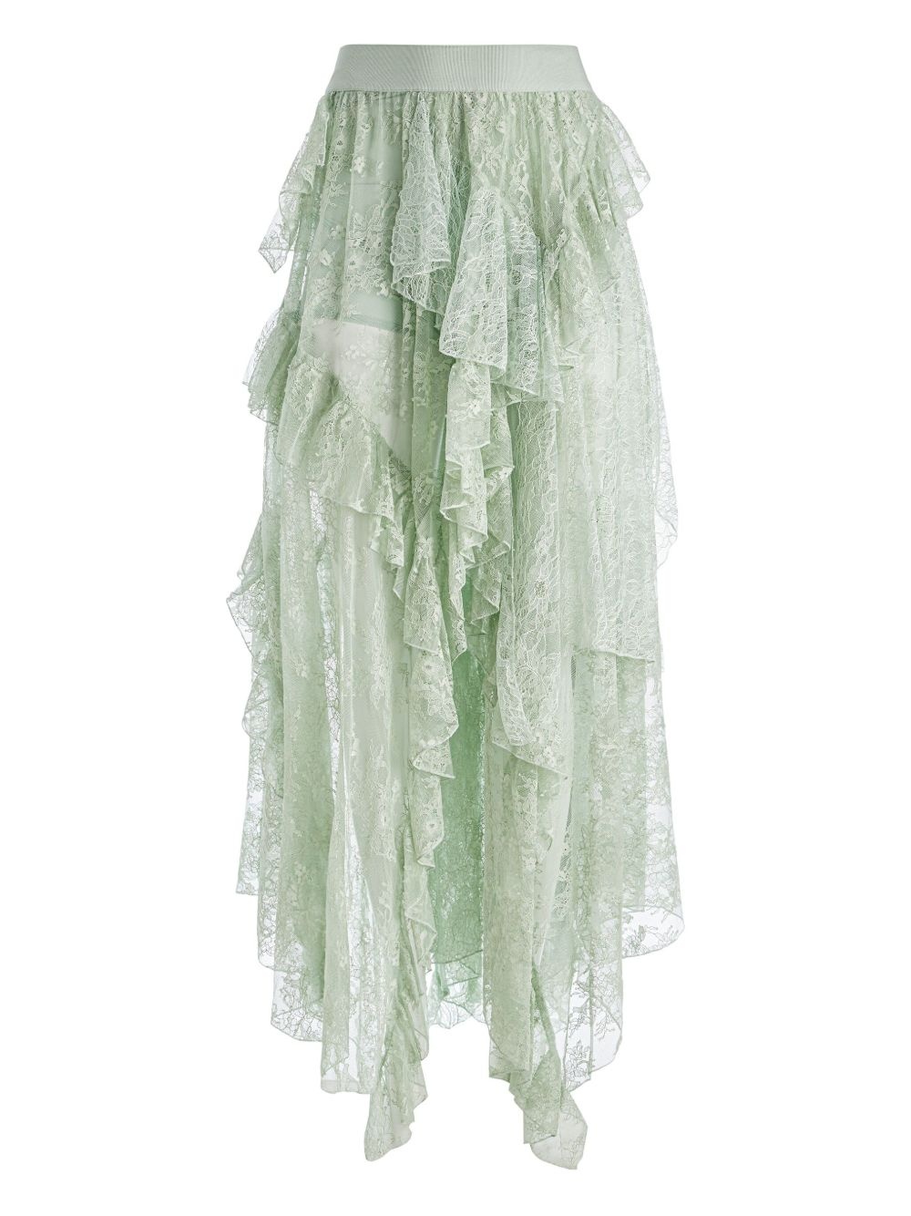 Karys asymmetric skirt Highlights - Light green - Lace - Tiered ruffles - Asymmetrical hem - High waist - Elastic waistband Imported Composition Nylon 60%, pure cotton 25%, Polyester 15% Washing instructions Dry Clean Only