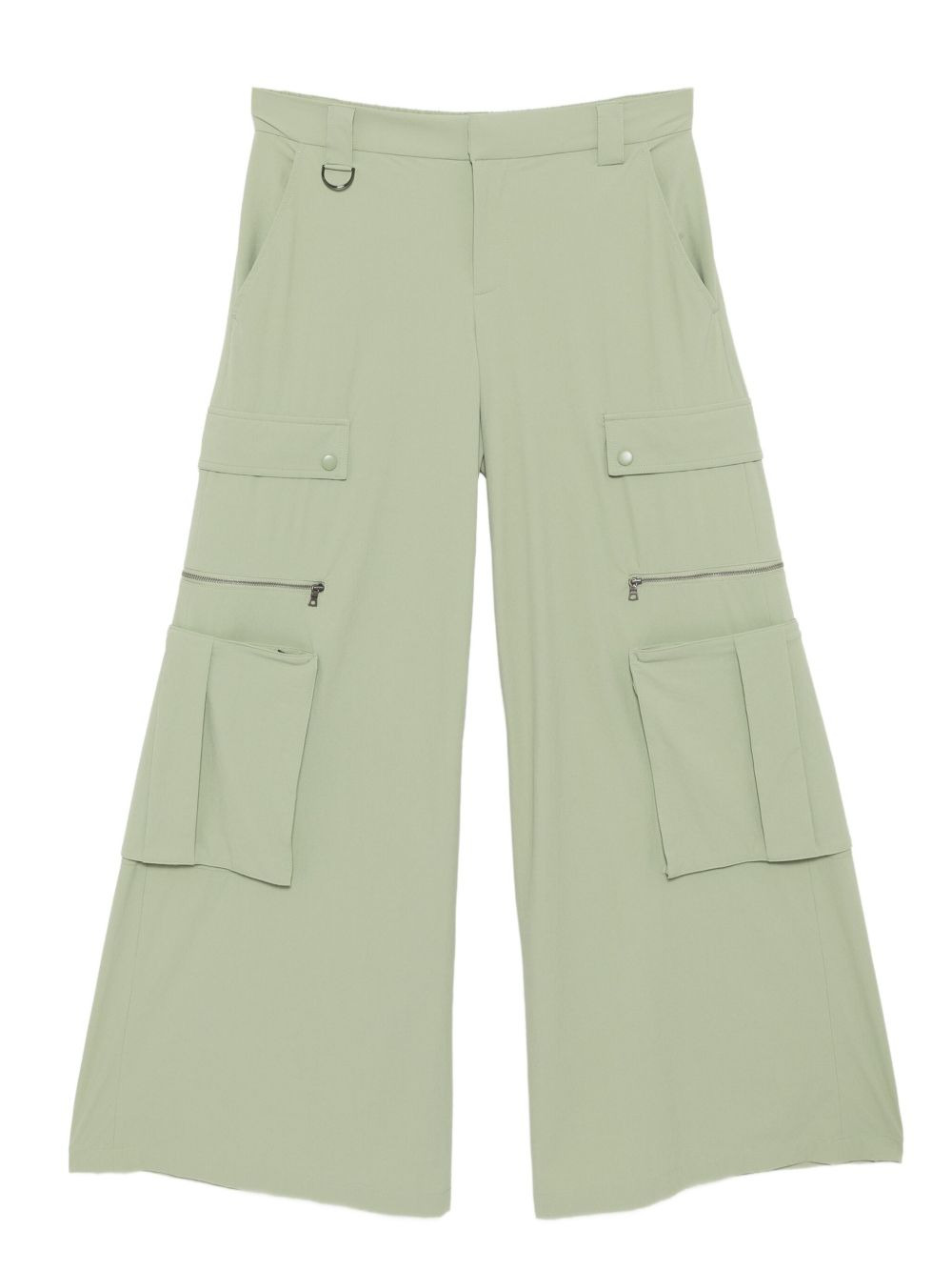 Sara cargo trousers Highlights - Sage green - Concealed front hook and zip fastening - Rear elasticated waistband - Two side slash pockets - Two rear flap pockets Imported Composition Outer: Recycled Nylon 85%, Elastane 15% Lining: Recycled Polyester 100% SIZE & FIT Model measurements Height 5 ft 10 in(1.78 m) Bust/Chest 31.88 in(81 cm) Hips 37 in(94 cm) Waist 25.19 in(64 cm) FittingInformation Designed with a wide-leg cut, these trousers allow for a close fit at the waist and offer a loose and roomy fit over the leg The partially elasticated waistband offers increased movement and comfort at the waist Made from a midweight stretch fabric, this piece offers elasticity and flexibility when worn Washing instructions Machine Wash