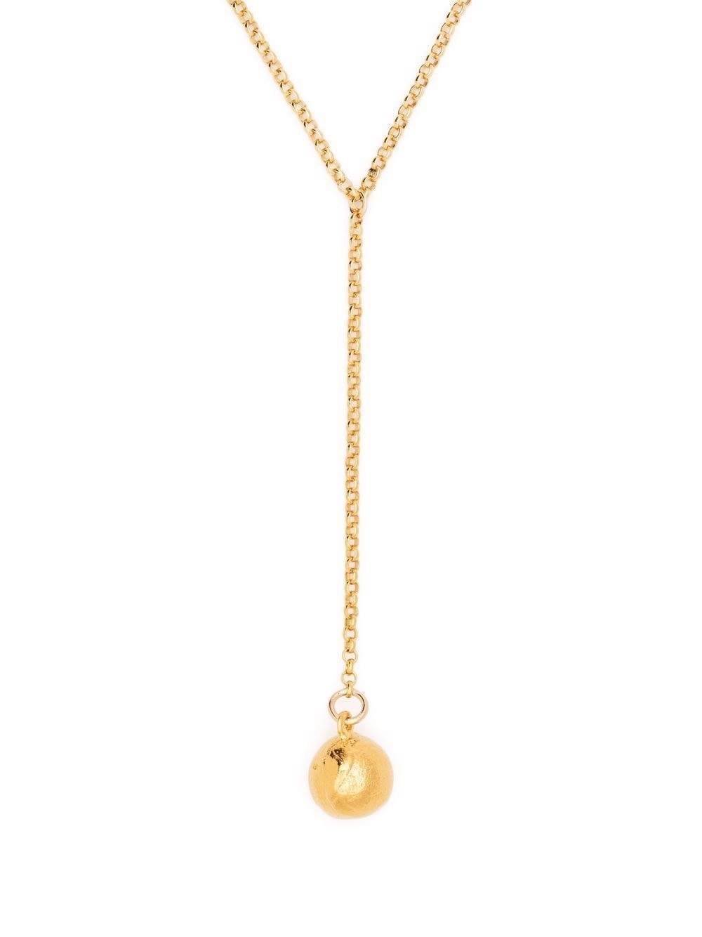 Pendulum of the Night necklace Inspired by Dante's third and final part of The Divine Comedy, 'Paradiso', Alighieri looks up to the moon for guidance and presents the Pendulum of the Night necklace, handcrafted in London's Hatton Garden from 24kt gold-plated bronze. A textured spherical pendant takes centre stage and hangs delicately from a cable-link chain. Made in United Kingdom SIZE & FIT Measurement Length when open 17.71 in(45 cm) PENDANT LENGTH 3.38 in(8.6 cm) PENDANT WIDTH 0.47 in(1.2 cm) WIDTH 0.07 in(0.2 cm)