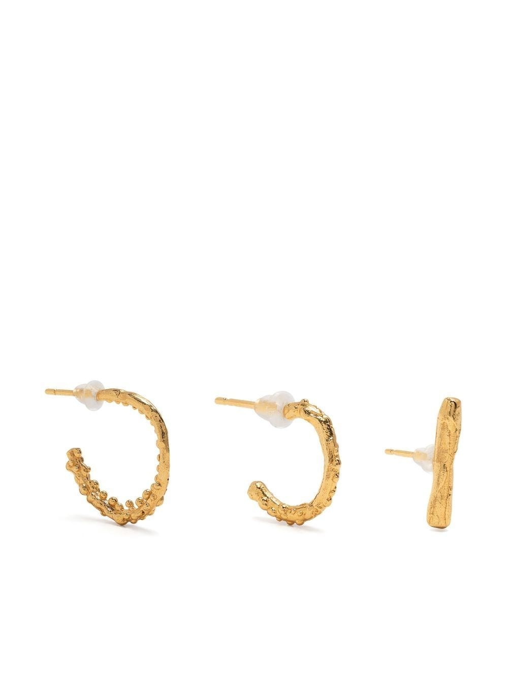 Starry Night earrings set of three gold plated hammered-effect finish butterfly fastening set of three for pierced ears Made in United Kingdom SIZE & FIT Model measurements Height 5 ft 10 in(1.78 m) Bust/Chest 31.49 in(80 cm) Hips 36.22 in(92 cm) Waist 25.59 in(65 cm) Measurement HEIGHT 0.7 in(1.8 cm) Weight (single earring) 2 g(2 g) WIDTH 0.07 in(0.2 cm)