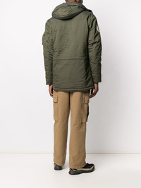 Polar hooded jacket dark green nylon detachable faux-fur trimmed hood front button and zip fastening two zip-fastening chest pockets two side flap pockets sleeve zip pocket water resistant wind-resistant Imported Composition Outer: Acrylic 94%, Nylon 53%, Polyester 47%, Modacrylic 6% Lining: Acrylic 100%, Nylon 100%, Polyester 100% SIZE & FIT Model measurements Height 6 ft 2 in(1.89 m) Bust/Chest 35.43 in(90 cm) Hips 36.61 in(93 cm) Waist 28.74 in(73 cm) FittingInformation This piece fits true to size. We recommend you get your regular size Cut for a loose fit Made with a mid-weight non-stretch fabric