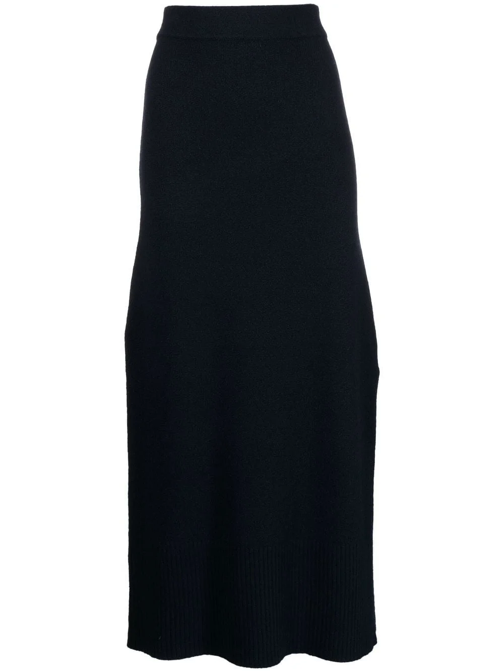 high-waisted knitted midi skirt navy blue knitted construction elasticated waistband high waist side slit mid-length Imported Composition Wool 34%, Polyamide 34%, Viscose 29%, Polyester 3% SIZE & FIT Model measurements Height 5 ft 11 in(1.8 m) Bust/Chest 28.34 in(72 cm) Hips 35.43 in(90 cm) Waist 23.62 in(60 cm) FittingInformation This piece fits true to size. We recommend you get your regular size Designed to be fitted at the waist and hips, loose over the leg Made with a mid-weight fabric Washing instructions Dry Clean Only