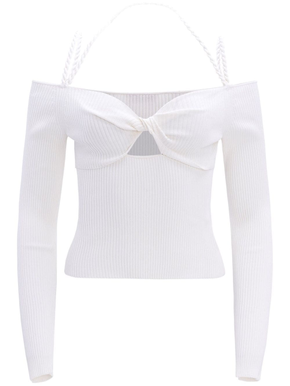 Odin cut-out ribbed-knit top white ribbed knit bralette style cut-out detailing halterneck sweetheart neck square open back spaghetti straps open-shoulder long sleeves straight hem Imported Composition Viscose 100% Washing instructions Dry Clean Only