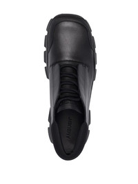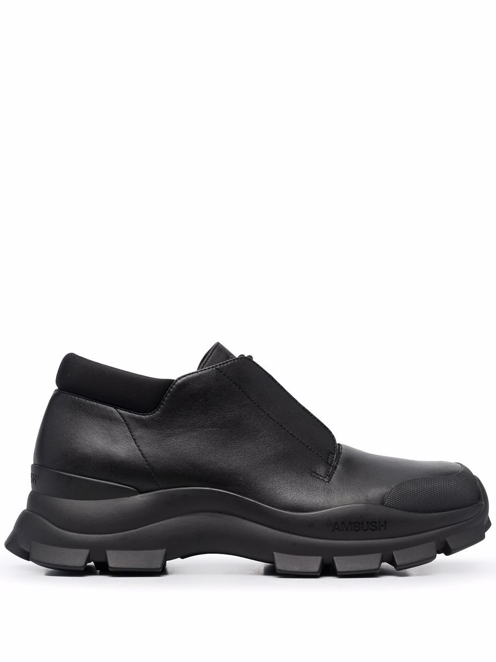 leather ankle boots Derby shoes are taken to boot status with this AMBUSH version that is constructed from smooth matte black leather and fastened with a silver-tone buckle fastening to the side. Sat upon a chunky ridged rubber sole, this footwear provides ample stability whilst on the move. Highlights - Black - Front lace-up fastening - Debossed logo to the side Imported Composition Outer: Leather 100% Sole: Rubber 100% Lining: Fabric 100%, Leather 100%