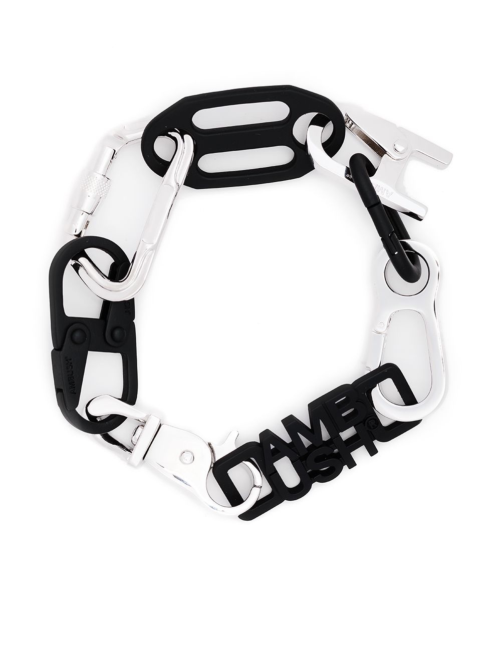 chain-link logo bracelet Add a dash of edginess to your look. Throw on this chain-link logo bracelet from AMBUSH and let it do the talking. Very much so. Highlights - Silver-tone/black - Silver/brass - Two-tone detail - Chain-link detailing - Logo lettering - Hook fastening Imported SIZE & FIT Model measurements Height 6 ft 1 in(1.85 m) Bust/Chest 37.79 in(96 cm) Hips 37.4 in(95 cm) Waist 30.7 in(78 cm)