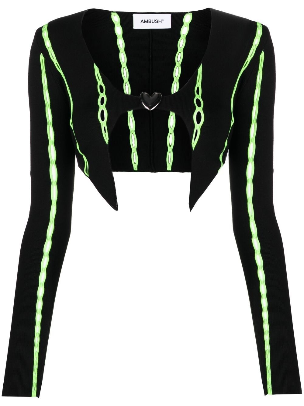 contrast-trim cropped cardigan AMBUSH's SS23 collection is inspired by Tokyo's club culture and rave scene, echoed in the energised silhouette of this cropped cardigan. Crafted with vibrant green openwork knit detailing, it's secured with a silver-tone heart buckle that emphasises the joyous mood. Made in Italy Composition Viscose 71%, Polyester 24%, Polyamide 5% SIZE & FIT Model measurements Height 5 ft 10 in(1.78 m) Bust/Chest 31.49 in(80 cm) Hips 35.03 in(89 cm) Waist 23.62 in(60 cm) FittingInformation This piece fits true to size. We recommend you get your regular size Cut for a close fit Made with a mid-weight fabric Washing instructions Hand Wash
