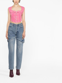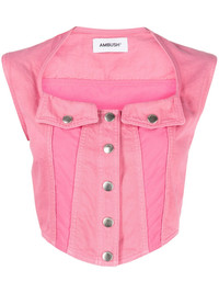 cropped denim top Made from cotton, this denim top by Ambush features a panelled design that adds depth and texture to the silhouette. With a cropped cut and curved hem, it reflects the brand's gentle way of being bold. Highlights - Bubblegum pink - Cotton - Denim - Panelled design - Two chest flap pockets - Sleeveless - Front press-stud fastening - Curved hem - Cropped Imported Composition Cotton 100%, Nylon 100% SIZE & FIT Model measurements Height 5 ft 10 in(1.78 m) Bust/Chest 30.7 in(78 cm) Hips 34.64 in(88 cm) Waist 23.22 in(59 cm) FittingInformation Designed for a slim fit that sits just away from the body offering a close yet comfortable fit Made from a midweight non-stretch fabric This piece fits true to size – take your usual size Washing instructions Hand Wash