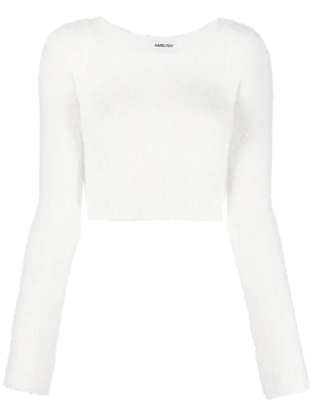 cropped long-sleeve jumper Cut to a simple long-sleeve cropped silhouette, this white jumper by AMBUSH features a fluffy effect for a textured finish. Made in Italy Composition Polyamide 100% SIZE & FIT Model measurements Height 5 ft 10 in(1.78 m) Bust/Chest 33.07 in(84 cm) Hips 35.82 in(91 cm) Waist 25.98 in(66 cm) FittingInformation This piece fits true to size. We recommend you get your regular size Cut for a close fit Made with a lightweight fabric Washing instructions Hand Wash