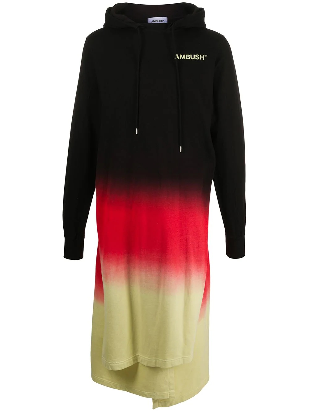 gradient long hoodie Bigger is better. This black, red and yellow cotton gradient hoodie dress from AMBUSH means it doesn't really matter what trousers you choose. You're covered. Highlights - Black/red/yellow - Cotton - Gradient effect - Wrap design - Logo print at the chest - Drawstring hood - Front tie fastening - Long sleeves - Mid-length Imported Composition Cotton 100% SIZE & FIT Model measurements Height 5 ft 9 in(1.75 m) Bust/Chest 32.67 in(83 cm) Hips 36.22 in(92 cm) Waist 24.8 in(63 cm) FittingInformation This piece is unisex. Please take care when selecting your size Designed for a loose fit for men and an oversized fit for women Made with a mid-weight fabric Washing instructions Machine Wash