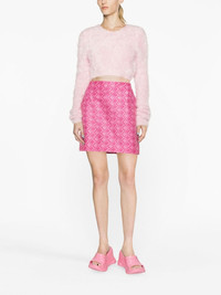 knitted cropped sweater The wispy, fuzzy finish and baby-pink hue of this AMBUSH sweater are reminiscent of the noughties era. The cropped fit is balanced with long sleeves that bunch at the wrist. Highlights - Light pink - Knitted construction - Crew neck - Long sleeves - Cropped - Ribbed cuffs and hem Made in Italy Composition Nylon 100% SIZE & FIT Model measurements Height 5 ft 9 in(1.75 m) Bust/Chest 31.49 in(80 cm) Hips 34.05 in(86.5 cm) Waist 24.21 in(61.5 cm) FittingInformation Designed for a slim fit that sits just away from the body offering a close yet comfortable fit Cropped in length Made with a midweight knit, this piece offers some stretch This piece fits true to size – take your usual size Washing instructions Hand Wash