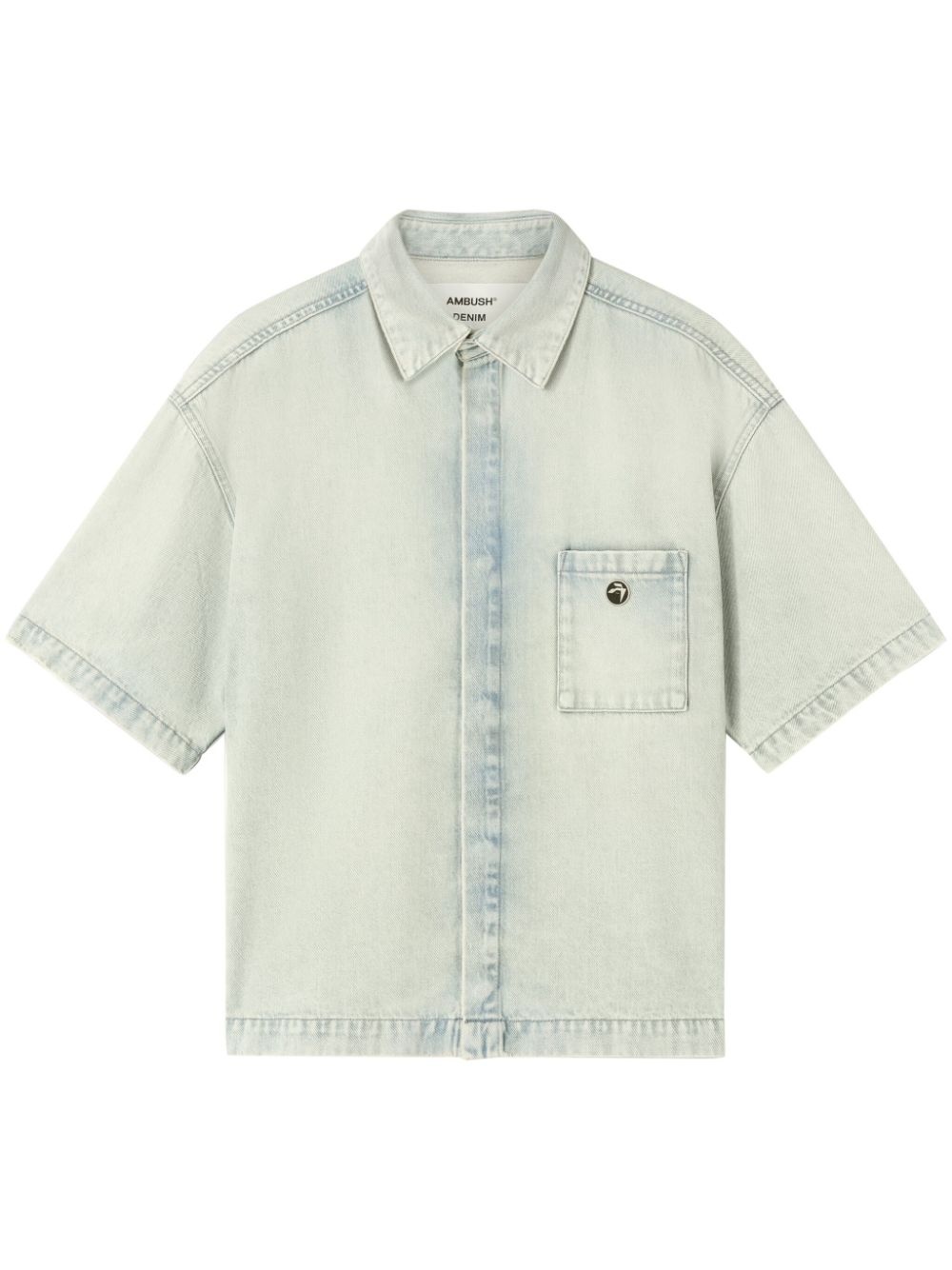 logo-applique denim shirt AMBUSH takes inspiration from boxy silhouettes of the ‘50s. In keeping with the theme, this washed-denim shirt is crafted to a drop-shoulder silhouette and finished with a logo applique. Highlights - Light blue - Cotton - Washed denim - Applique logo - Classic collar - Drop shoulder - Short sleeves - Concealed front fastening - Straight hem Made in Italy Composition Cotton 100% Washing instructions Read Manufacturer Guidelines