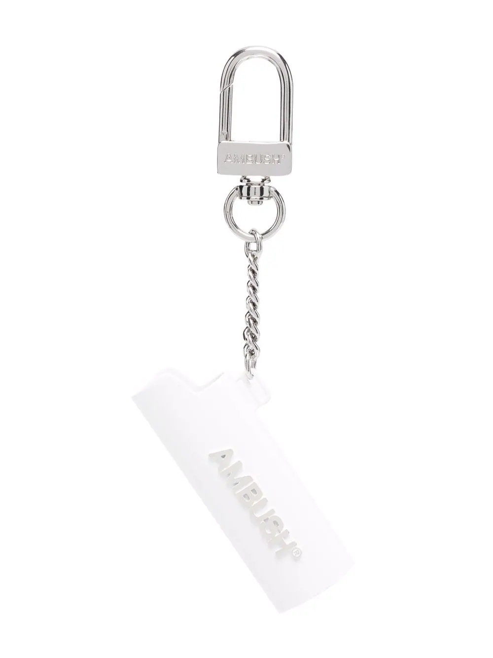 logo-lettering case keychain Known for its distinct experimental aesthetic, AMBUSH presents this lighter case keychain. In a functional design, this accessory is finished with silver-toned logo lettering. Highlights - White - Silver-tone logo lettering - Chain-link detailing - Engraved logo - Clasp fastening Imported Composition stainless steel 100% SIZE & FIT Measurement LENGTH 6.29 in(16 cm) WIDTH 1.18 in(3 cm)