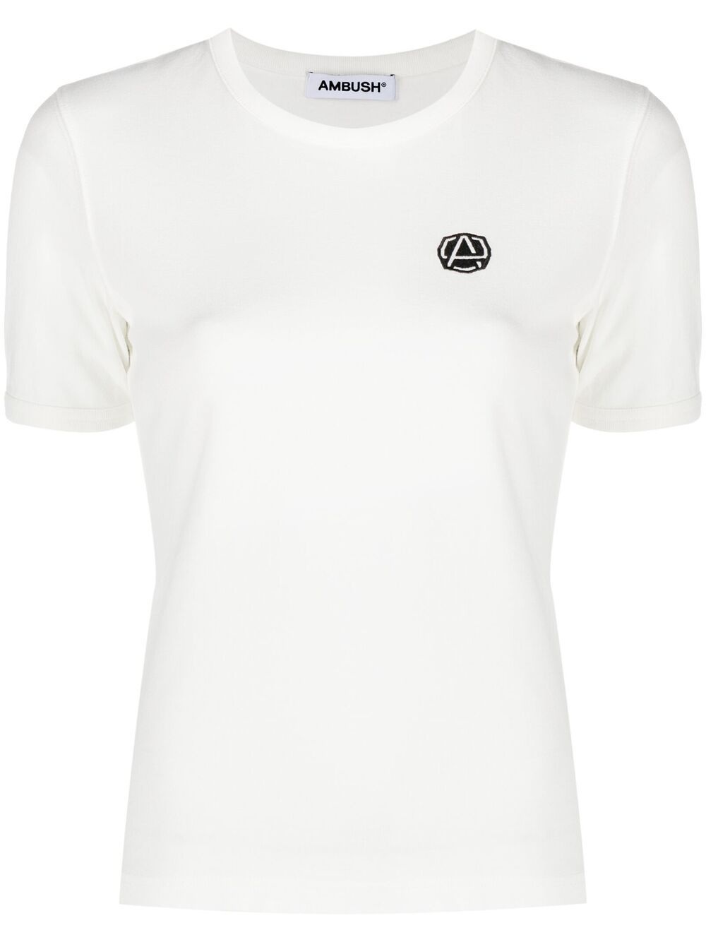 logo patch crew-neck T-shirt A little goes a long way. Constructed from soft cotton, this emblem patch slim-fit T-shirt from AMBUSH proves that you don't need much to be the coolest gal on the block. Your besties will want the same one. Imported Composition Cotton 100%, Polyester 100% SIZE & FIT Model measurements Height 5 ft 10 in(1.78 m) Bust/Chest 33.07 in(84 cm) Hips 35.82 in(91 cm) Waist 25.98 in(66 cm) FittingInformation This piece fits true to size. We recommend you get your regular size Cut for a slim fit Made with a mid-weight fabric Washing instructions Machine Wash