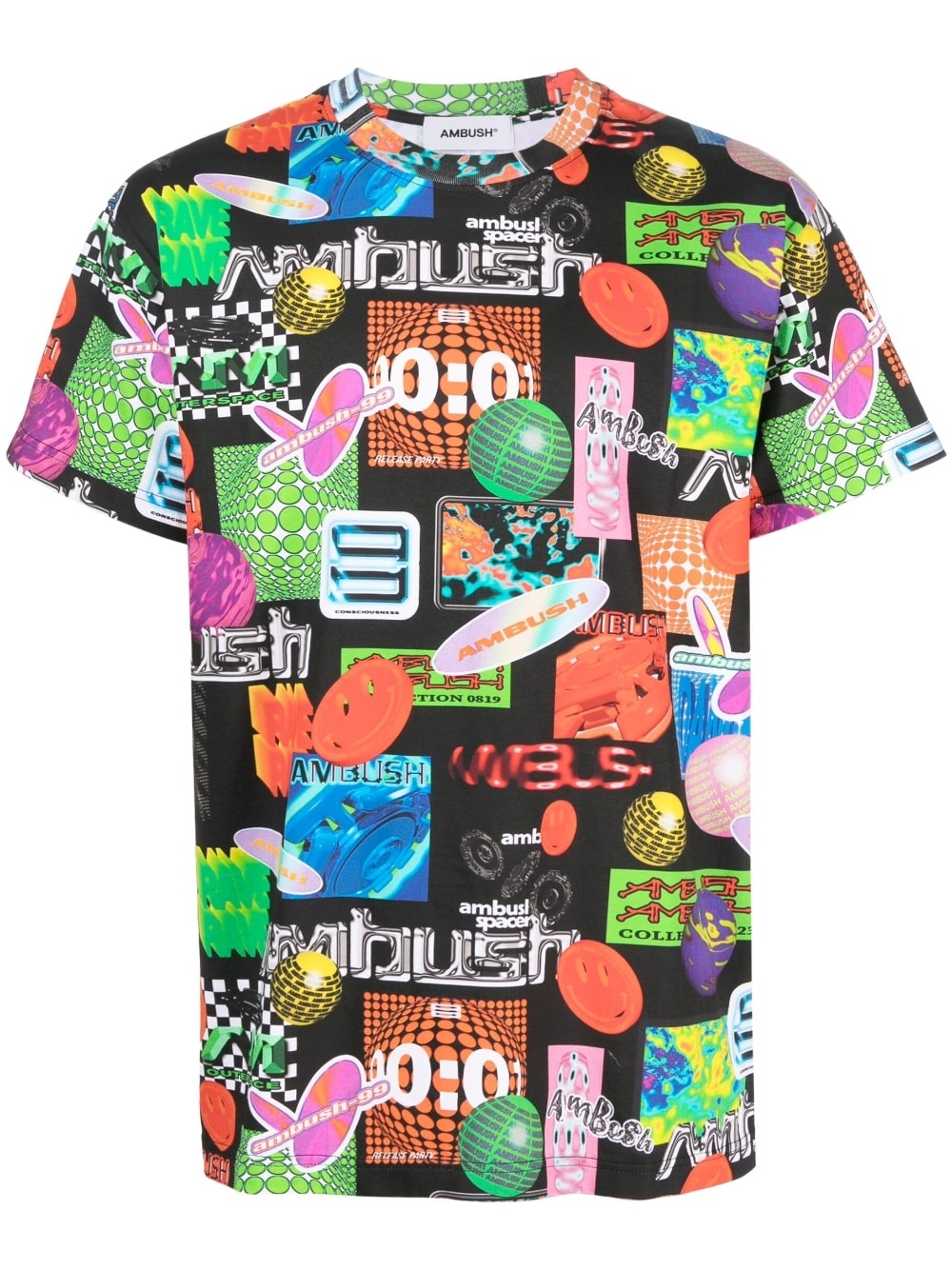logo-print cotton T-shirt AMBUSH's experimental roots inform its SS23 collection, as evidenced by this vibrant cotton T-shirt. It's decorated throughout with punchy sticker-inspired graphics that emphasise the bold mood. Highlights - Black/multicolour - Cotton - All-over logo print - All-over graphic print - Crew neck - Short sleeves - Straight hem - When buying this unisex item, keep in mind that it is graded in standard men's sizing. Imported Composition Cotton 100% SIZE & FIT Model measurements Height 5 ft 11 in(1.8 m) Bust/Chest 31.49 in(80 cm) Hips 35.82 in(91 cm) Waist 24.8 in(63 cm) FittingInformation This unisex piece is designed for a loose fit whether you usually select women's or men's sizes Made from a midweight non-stretch fabric, this piece offers minimal elasticity when worn Washing instructions Machine Wash