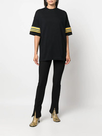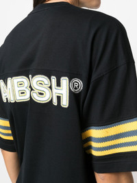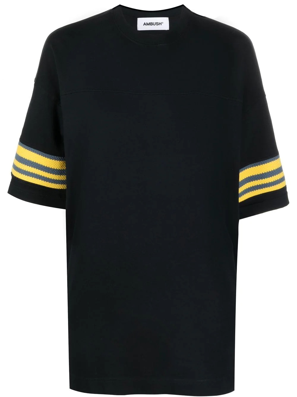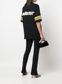 logo-print short-sleeve T-shirt Inspired by art, AMBUSH garments are known for their innovative focus on shapes, colours and textures. Adding a contemporary edge to this AW22 collection top, the garment features stripe detailibng and a logo print across the back. Highlights - Black - Cotton - Round neck - Short sleeves - Stripe detailing - Logo print to the rear Made in Italy Composition Cotton 100%, Polyamide 100% SIZE & FIT Model measurements Height 5 ft 11 in(1.8 m) Bust/Chest 33.07 in(84 cm) Hips 37.4 in(95 cm) Waist 25.19 in(64 cm) FittingInformation This piece fits true to size. We recommend you get your regular size Cut for a loose fit Made with a mid-weight fabric Washing instructions Machine Wash