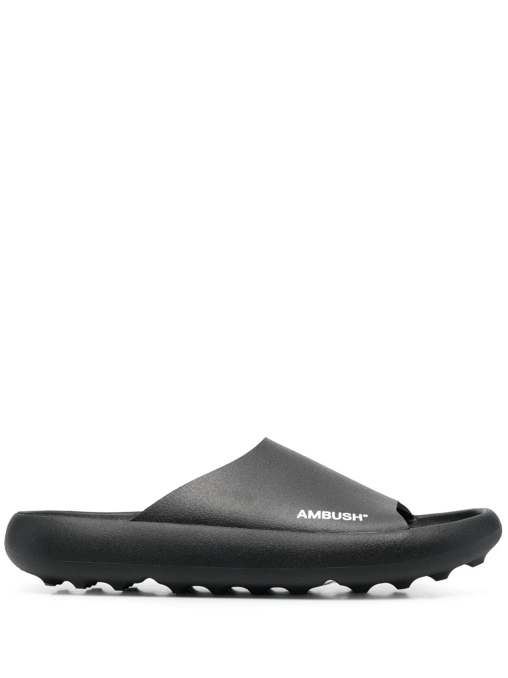 logo-print slide sandals AMBUSH lends the classic rubber slides a streetwear aesthetic by simply updating the design with a chunkier silhouette. The black-hued pair is simply detailed with a small white logo print at the side. Highlights - Black - Logo print to the side - Open toe - Slip-on style - Branded insole - Moulded footbed - Ridged rubber sole - When buying this unisex item, keep in mind that it is graded in standard men's sizing. Imported Composition Lining: Synthetic Rubber 100% Sole: Synthetic Rubber 100% Outer: Synthetic Rubber 100% SIZE & FIT Measurement HEEL 1.37 in(3.5 cm) Sole height 0.78 in(2 cm)