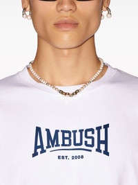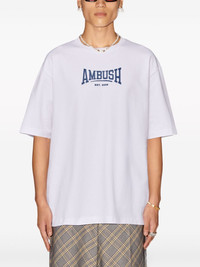 logo-print T-shirt Beginning as an experimental jewellery line, AMBUSH has evolved to create apparel, designed as a canvas to complement its accessories. A case in point, this white organic cotton T-shirt is adorned with a varsity-inspired logo print at the chest. Highlights - Off-white/navy blue - Organic cotton - Logo print to the front - Crew neck - Drop shoulder - Short sleeves - Straight hem Imported Composition Organic Cotton 100% SIZE & FIT Measurement CHEST 41.73 in(106 cm) SLEEVE LENGTH 9.44 in(24 cm) LENGTH 26.37 in(67 cm) Shoulder Width 18.89 in(48 cm) Washing instructions Read Manufacturer Guidelines