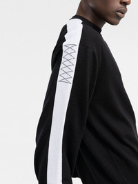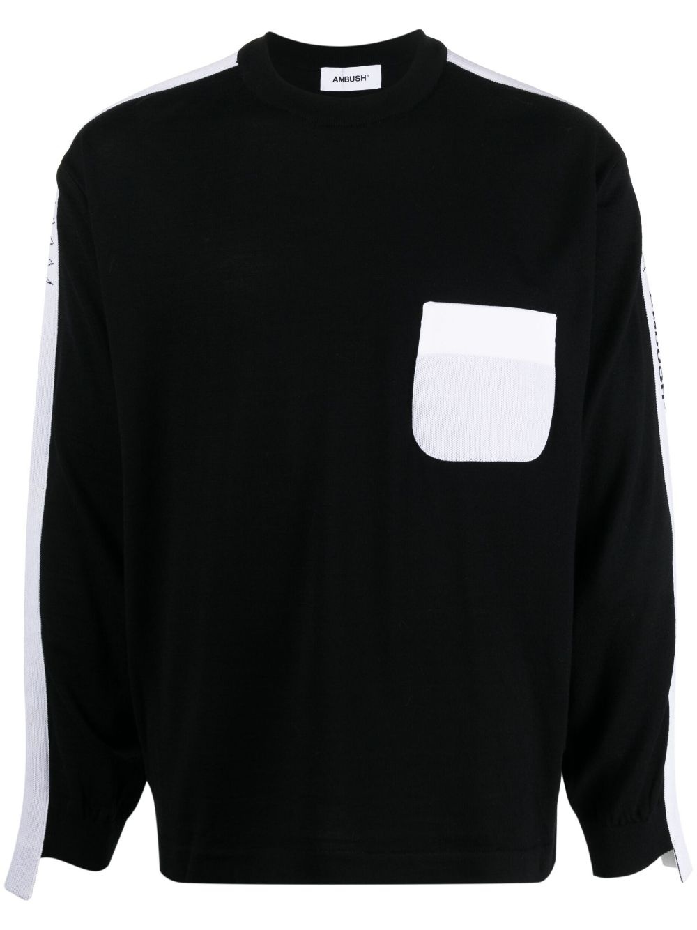 logo-tape knit jumper Eye-catching yet versatile, this jumper from AMBUSH reflects the brand's subversive aesthetic. Constructed from wool-blend in a black hue, this jumper follows a classic silhouette and is elevated by its contrasting logo-tape detail and logo patch at the chest. Imported Composition Wool 98%, Polyester 73%, Cotton 27%, Polyamide 1%, Polyurethane 1% SIZE & FIT Model measurements Height 6 ft 1 in(1.85 m) Bust/Chest 34.64 in(88 cm) Hips 34.25 in(87 cm) Waist 27.55 in(70 cm) FittingInformation This piece fits true to size. We recommend you get your regular size Cut for a loose fit Made with a mid-weight fabric Washing instructions Hand Wash