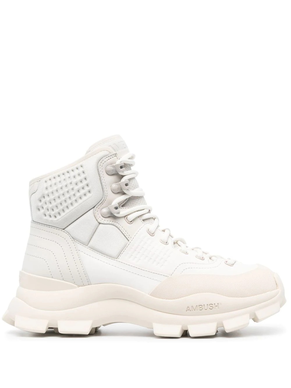 lug-sole hiking boots AMBUSH merges the traditional with the contemporary in this pair of boots. The hiking-style silhouette sits atop a chunky rubber lug sole, for an off-beat, modern finish. Imported Composition Leather 100%