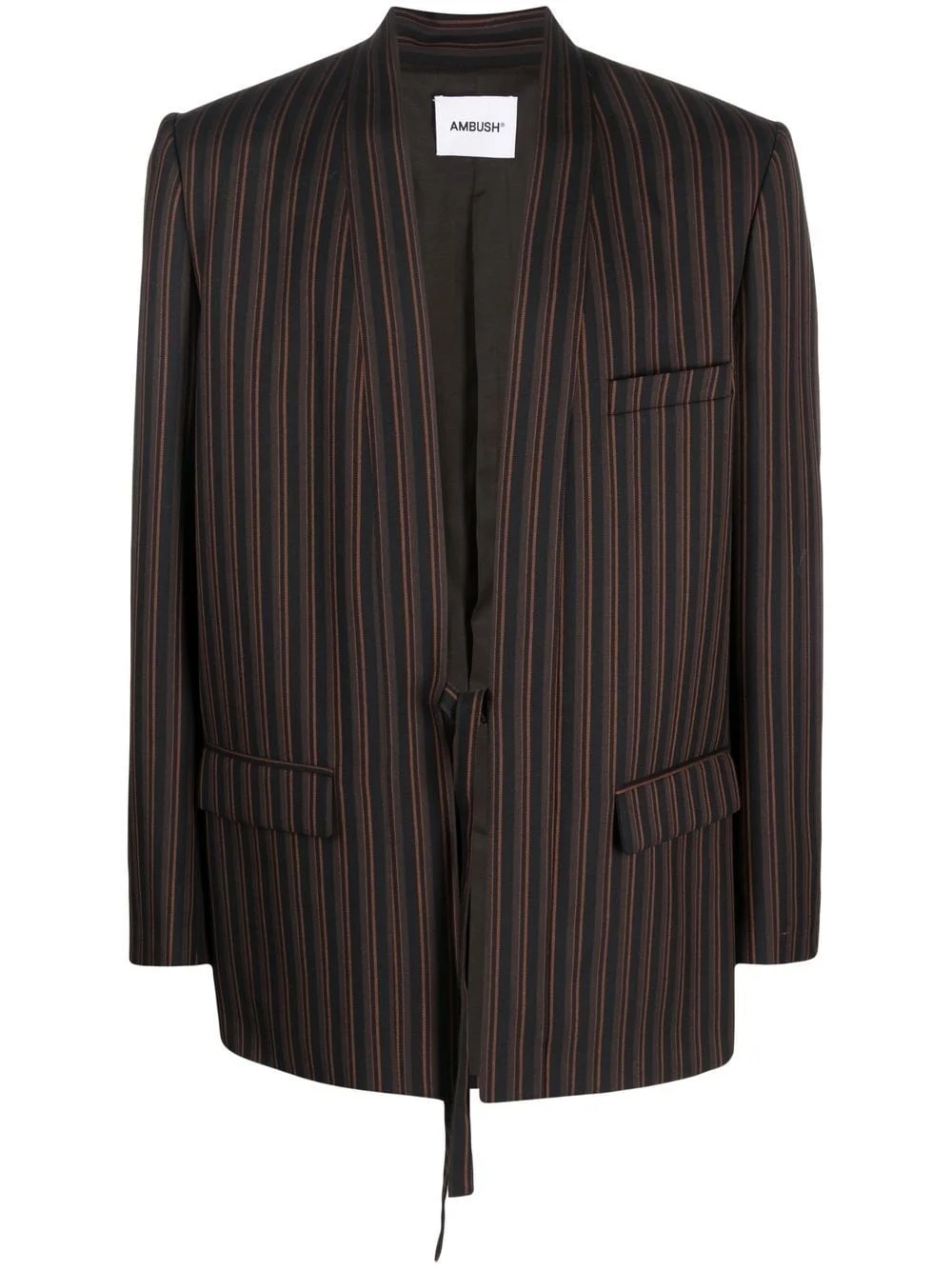 pinstripe single-breasted blazer brown virgin wool/cotton pinstripe pattern shawl lapels front tie fastening two side flap pockets chest welt pocket Made in Italy Composition Outer: Virgin Wool 100%, Viscose 51%, Cotton 49% Lining: Cotton 100% SIZE & FIT Model measurements Height 6 ft 2 in(1.87 m) Bust/Chest 38.18 in(97 cm) Hips 36.61 in(93 cm) Waist 29.13 in(74 cm) FittingInformation This piece fits true to size. We recommend you get your regular size Cut for a loose fit Made with a mid-weight non-stretch fabric Washing instructions Dry Clean Only