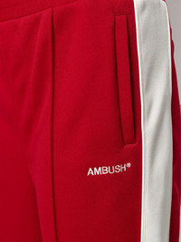 side stripe track trousers Red side stripe track trousers from AMBUSH featuring an elasticated waistband, side slit pockets, a tapered leg, a stripe detail to the side and creases. Imported Composition Polyester 100% SIZE & FIT Model measurements Height 5 ft 11 in(1.8 m) Bust/Chest 31.88 in(81 cm) Hips 35.43 in(90 cm) Waist 24.8 in(63 cm) Washing instructions Hand Wash