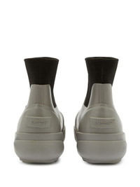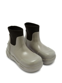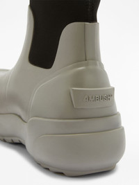 square-toe ankle boots AMBUSH's distinctive design style is showcased on this pair of rubber ankle boots, which feature an oversized square-toe silhouette and create a contemporary design. Highlights - Black/grey - Embossed logo to the side - Square toe - Elasticated side panels - Ankle-length - Branded heel counter - Flat rubber sole Imported Composition Leather 100%
