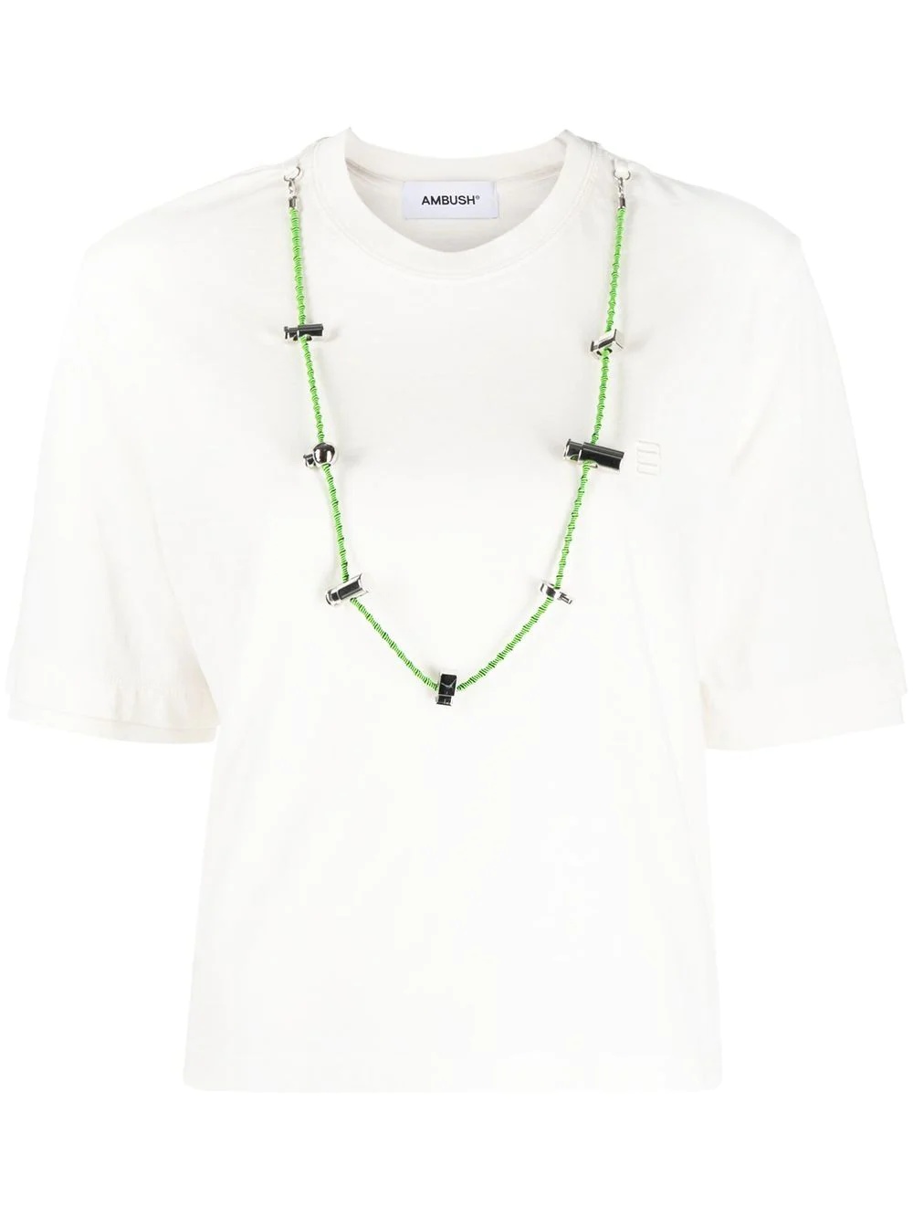 Stoppers boxy T-shirt Ambush updates a classic silhouette with a contemporary aesthetic with this short-sleeve T-shirt. Imagined in a fresh white hue, this design is elevated by toggle detailing, reflecting the modern style of the brand. Imported Composition Cotton 100%, Polyester 100% SIZE & FIT Model measurements Height 5 ft 10 in(1.78 m) Bust/Chest 33.07 in(84 cm) Hips 35.82 in(91 cm) Waist 25.98 in(66 cm) FittingInformation This piece fits true to size. We recommend you get your regular size Cut for a loose fit Made with a mid-weight fabric Washing instructions Machine Wash