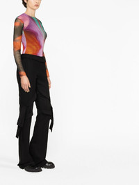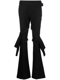 strap-detail flared trousers AMBUSH began as an experimental line of jewelry and has since expanded to bold garments, as seen with these flared trousers. The pair is complete with strap detailing at the legs, taking hints from the ‘90s Japanese rave scene. Highlights - Black - Virgin wool - Strap detailing - Mid-rise - Belted waist - Flared Made in Italy Composition Virgin Wool 100%, Viscose 100% SIZE & FIT Model measurements Height 5 ft 10 in(1.78 m) Bust/Chest 30.7 in(78 cm) Hips 34.64 in(88 cm) Waist 23.22 in(59 cm) FittingInformation Designed with a flared hem, these trousers allow for a close fit at the waist with a slim fit over the leg and widening towards the hem The belt offers adjustability for fitted preferences Made from a midweight non-stretch fabric This piece fits true to size – take your usual size Washing instructions Dry Clean Only