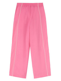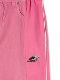 wide-leg panelled trousers A playful hybrid design that showcases AMBUSH's unique streetwear aesthetic, these wide-leg trousers boast a panelled design that combines a jeans-style front with track-pants detailing on the back. The pair is presented in a bright shade of pink for a finishing touch on its statement-making look. Highlights - Pink - Cotton - Panelled design - Front button and zip fastening - Rear elasticated waistband - Belt loops - Embroidered logo to the front - Side stripe detailing - Two side inset pockets. - Wide legs - When buying this unisex item, keep in mind that it is graded in standard men's sizing. Imported Composition Trims: Nylon 100% Nylon 100%, Cotton 100% Washing instructions Read Manufacturer Guidelines