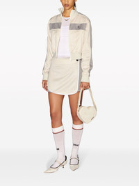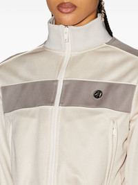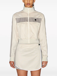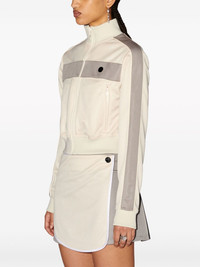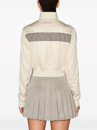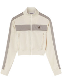 zip-up striped sweatshirt Highlights - Ecru/dark grey - Stripe detailing - Logo plaque - Cropped - High neck - Front zip fastening - Long sleeves - Ribbed cuffs and hem - Two side zip-fastening pockets - Straight hem Made in Italy Composition Polyester 100% Washing instructions Read Manufacturer Guidelines