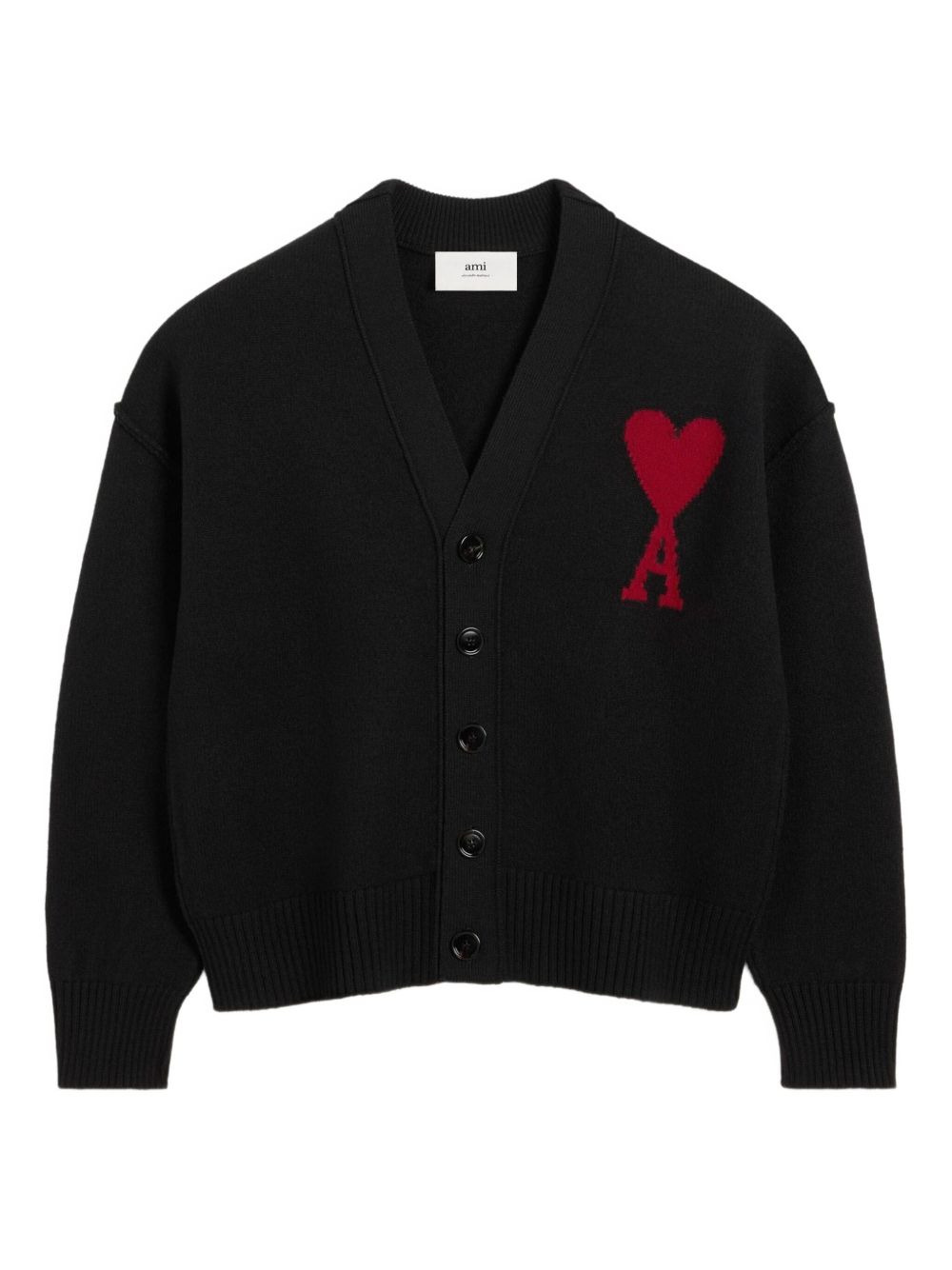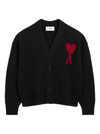 Ami de Coeur cardigan Highlights - Black/red - Wool - Intarsia-knit logo - Plunging v-neck - Front button fastening - Long sleeves - Straight hem - When buying this unisex item, keep in mind that it is graded in standard men's sizing. Imported Composition Wool 100% SIZE & FIT Measurement CHEST 43.3 in(110 cm) SLEEVE LENGTH 20.47 in(52 cm) Shoulder Width 21.65 in(55 cm) Washing instructions Read Manufacturer Guidelines