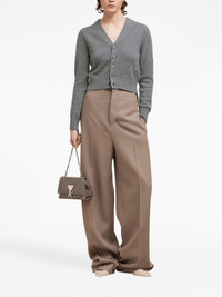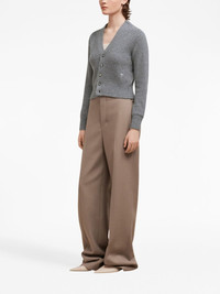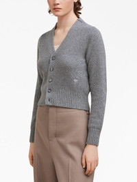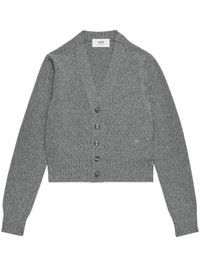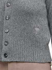 Ami de Coeur cardigan The Ami de Coeur monogram - translated literally as ‘AMI of Hearts’ - has a personal meaning to Alexandre Mattiussi, the designer of AMI Paris: it captures the relaxed, friendly nature that is at the heart of the approach of the brand. The symbol is presented on the lateral side of this grey knit cardigan, enhancing the brand's identity. Highlights - Grey - Wool-cashmere blend - Signature ami de coeur monogram motif - V-neck - Front button fastening - Long sleeves - Ribbed hem Made in Italy Composition Cashmere 97%, Wool 3% SIZE & FIT Measurement CHEST 31.49 in(80 cm) SLEEVE LENGTH 22.83 in(58 cm) LENGTH 19.29 in(49 cm)