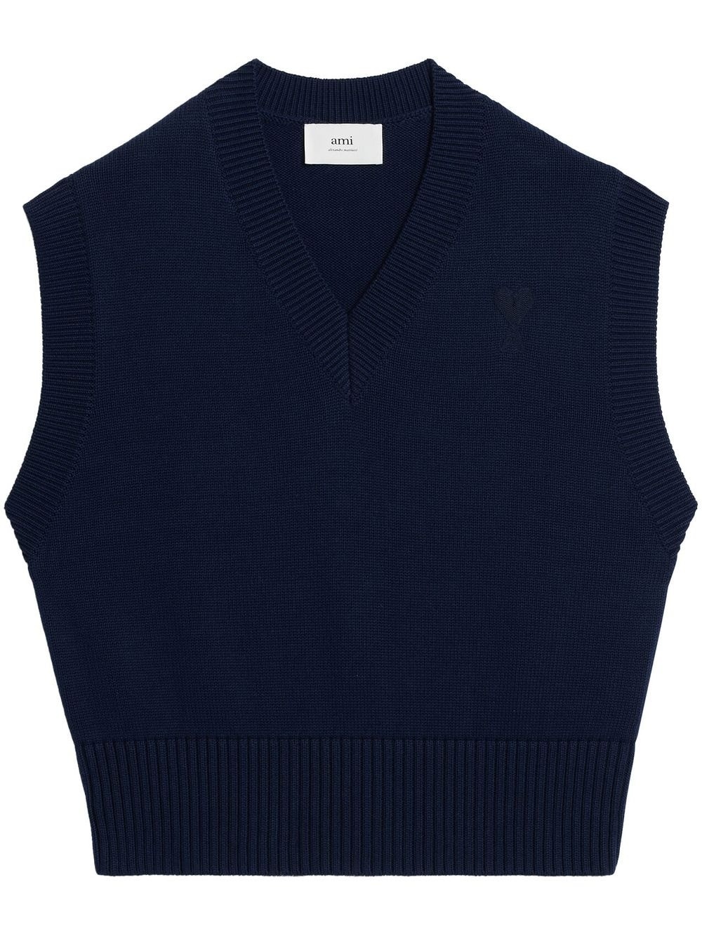 Ami de Coeur knitted vest Knitted from a sustainable blend of organic cotton and wool, this knitted vest from AMI Paris is subtly accented with a tone-on-tone Ami de Coeur embroidery at the chest. Highlights - Navy blue - Organic cotton-wool blend - Signature ami de coeur monogram motif - Knitted construction - V-neck - Sleeveless - Ribbed hem - When buying this unisex item, keep in mind that it is graded in standard men's sizing. Made in Italy Composition Organic Cotton 85%, Wool 15%